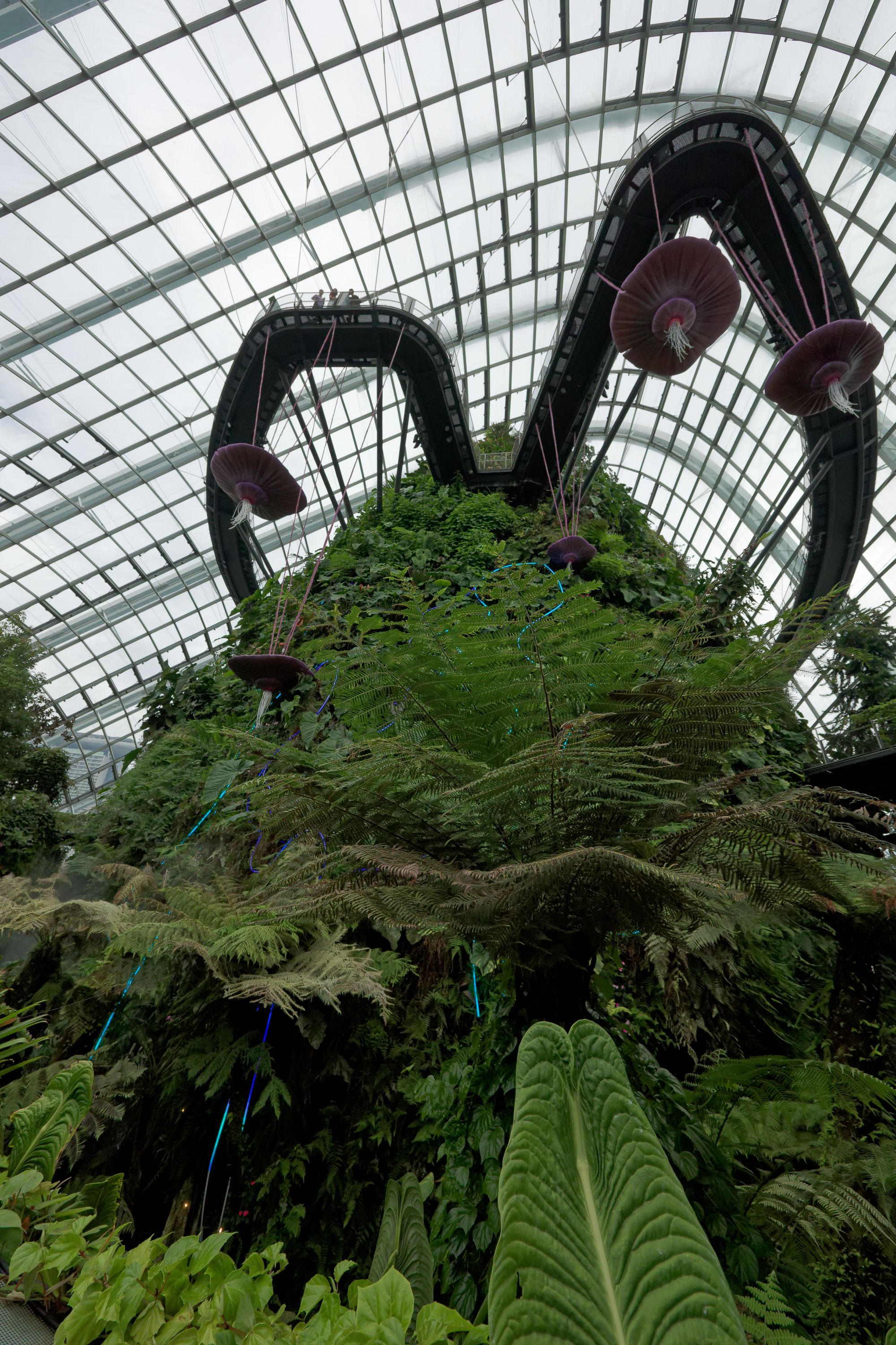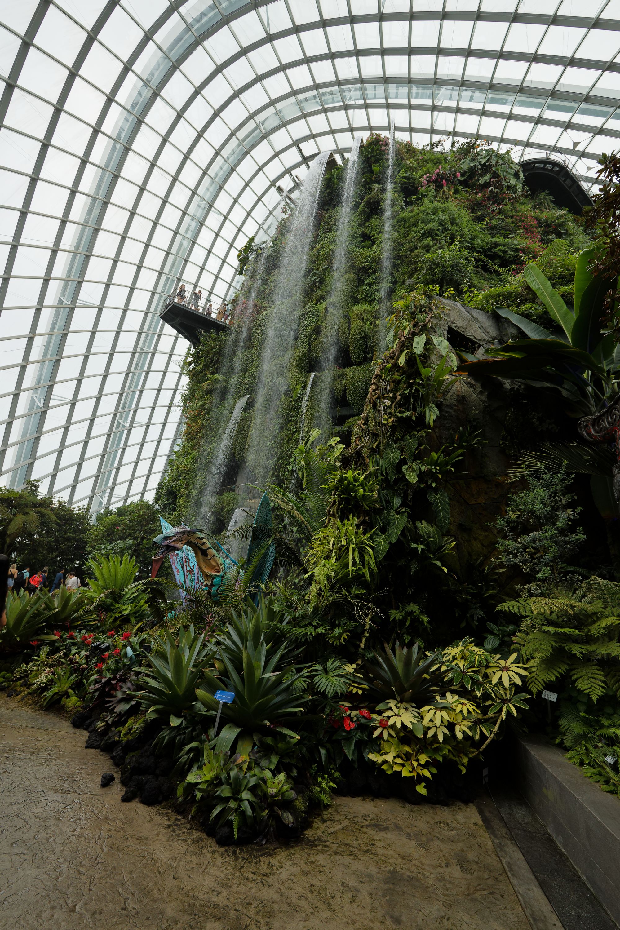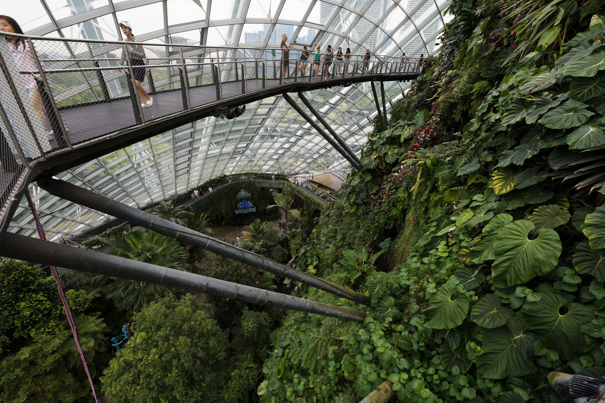 Le Cloud Forest offre une expérience unique en son genre, avec une cascade spectaculaire de 35 mètres de hauteur qui crée une ambiance de fraîcheur et d'humidité, simulant les conditions réelles d'une forêt tropicale montagneuse. Les murs du dôme sont recouverts de plantes épiphytes, de fougères, d'orchidées et d'autres végétations exotiques.