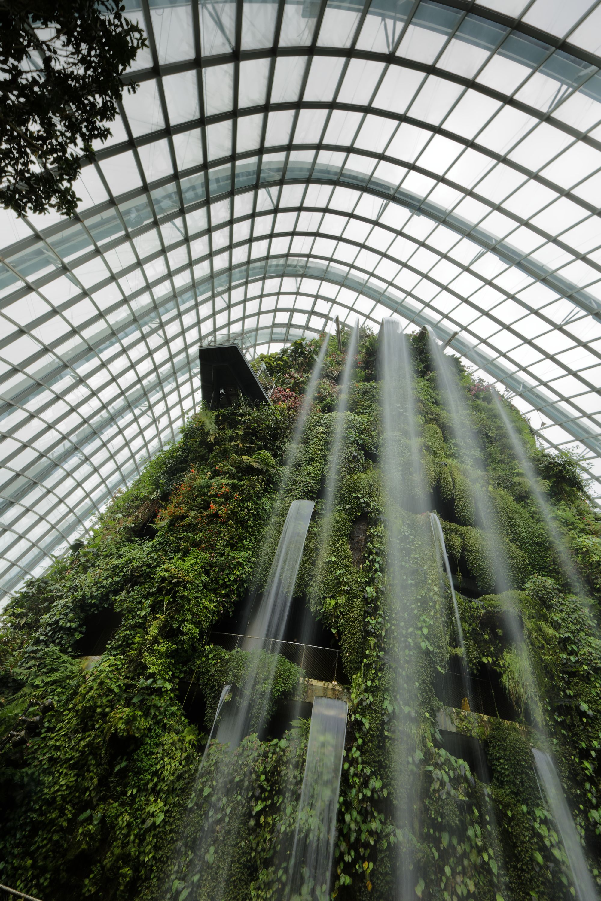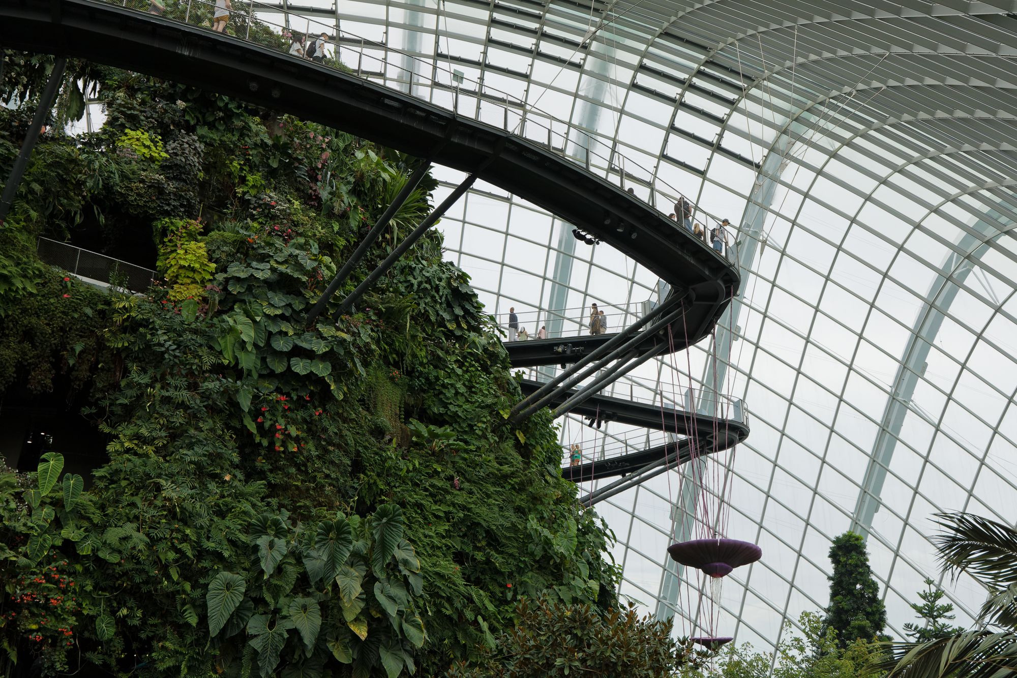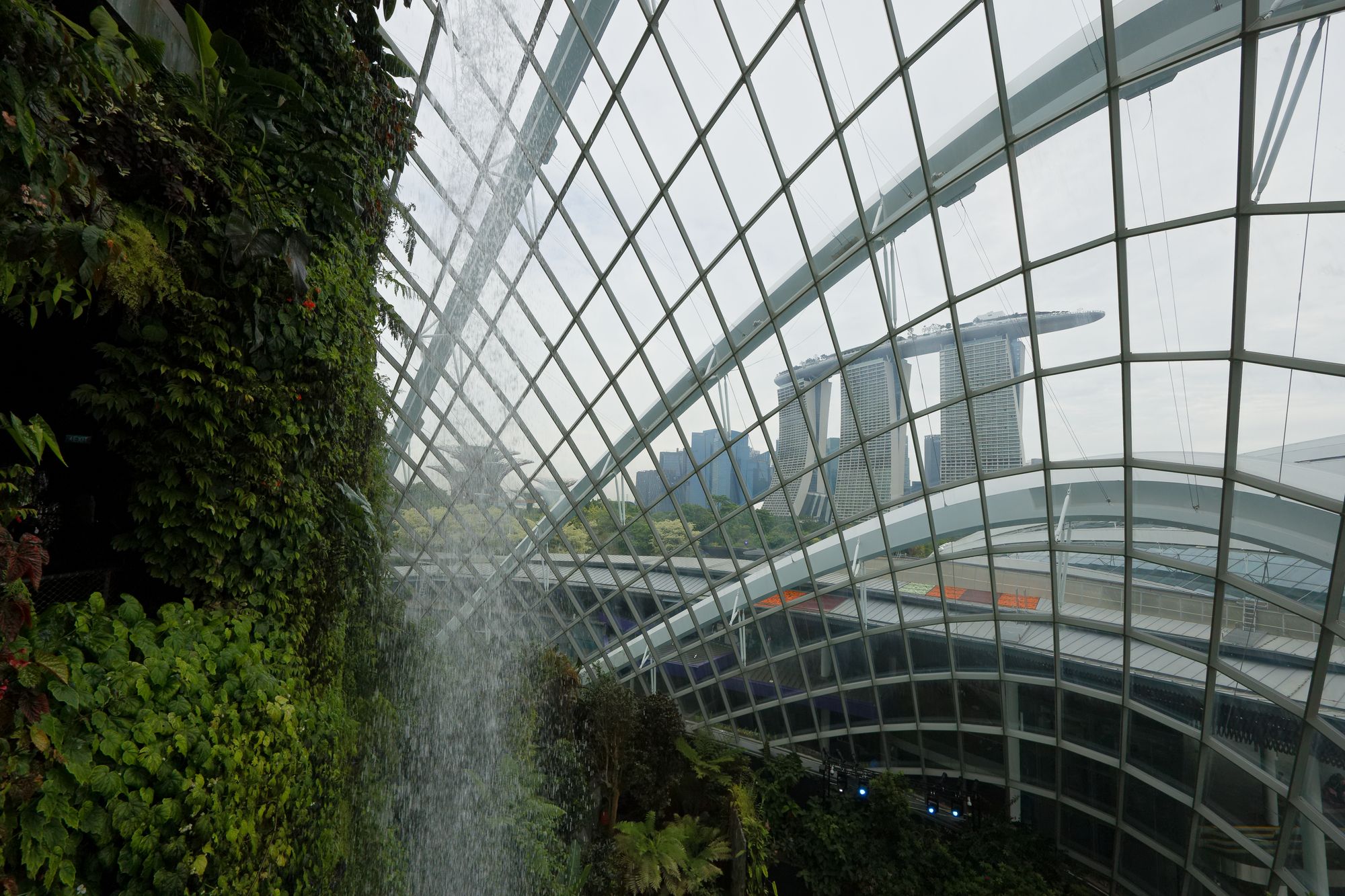 Le Cloud Forest offre une expérience unique en son genre, avec une cascade spectaculaire de 35 mètres de hauteur qui crée une ambiance de fraîcheur et d'humidité, simulant les conditions réelles d'une forêt tropicale montagneuse. Les murs du dôme sont recouverts de plantes épiphytes, de fougères, d'orchidées et d'autres végétations exotiques.