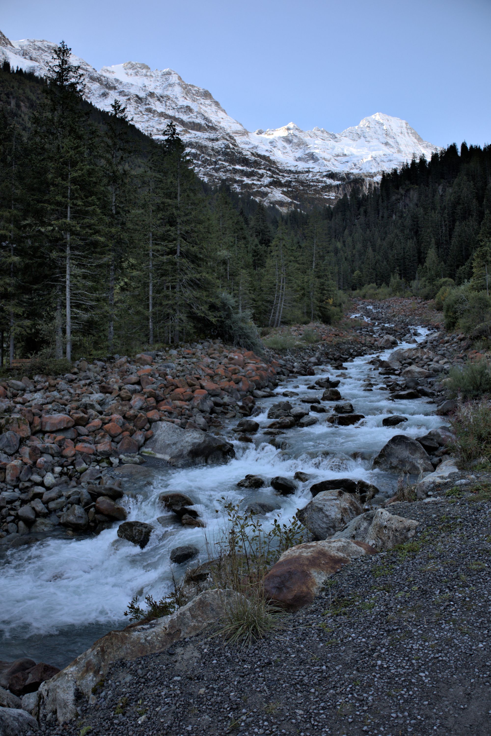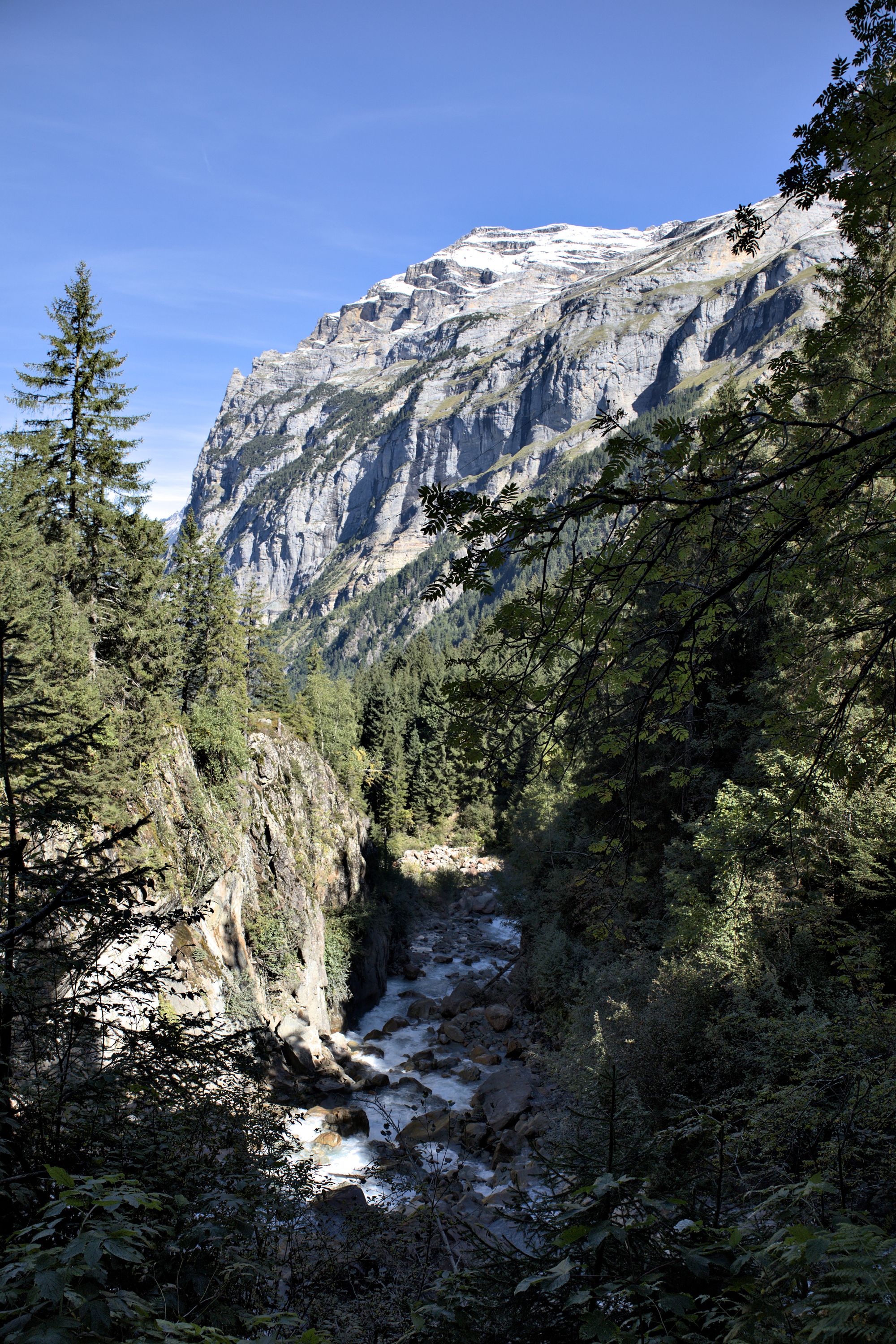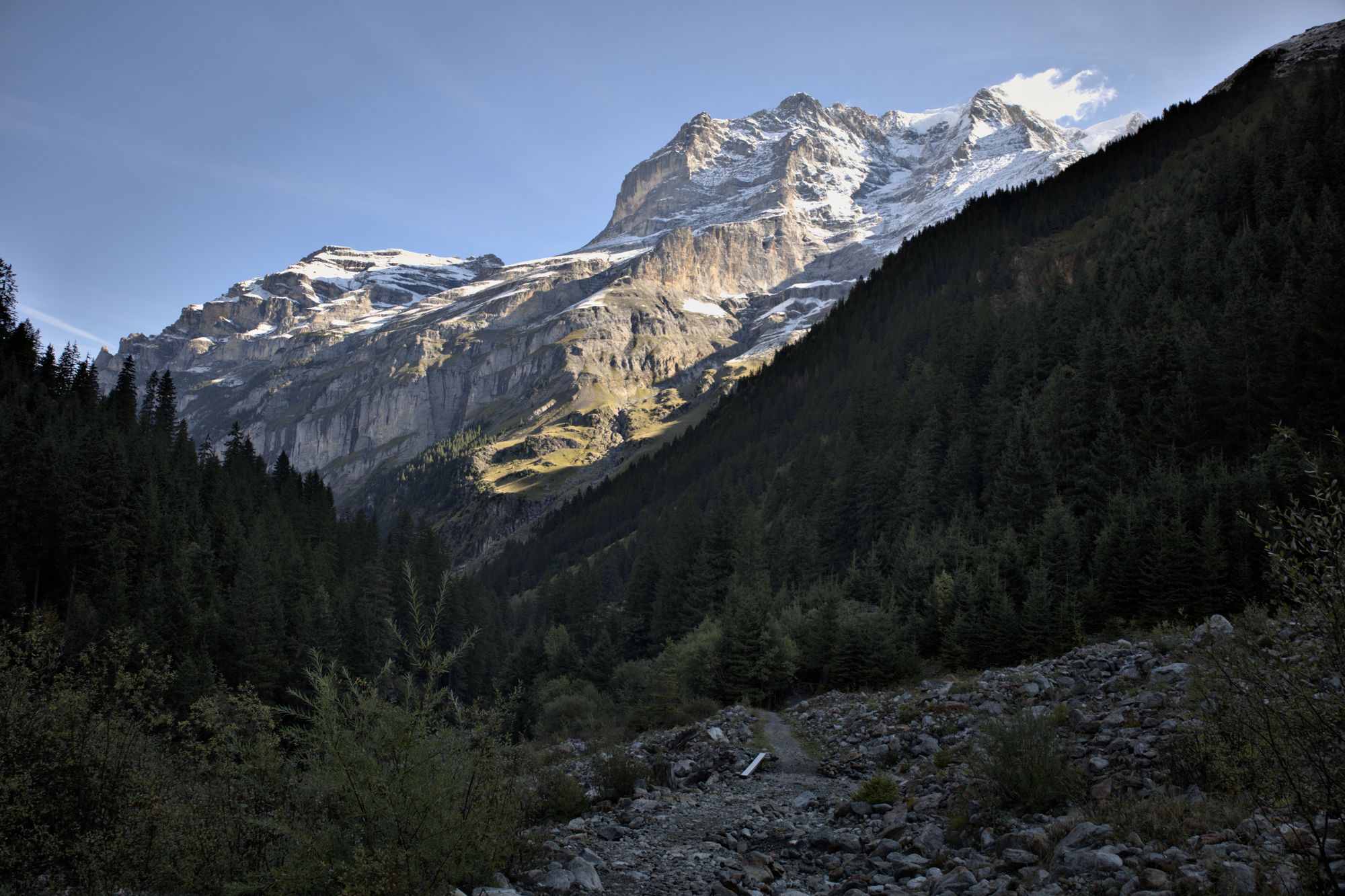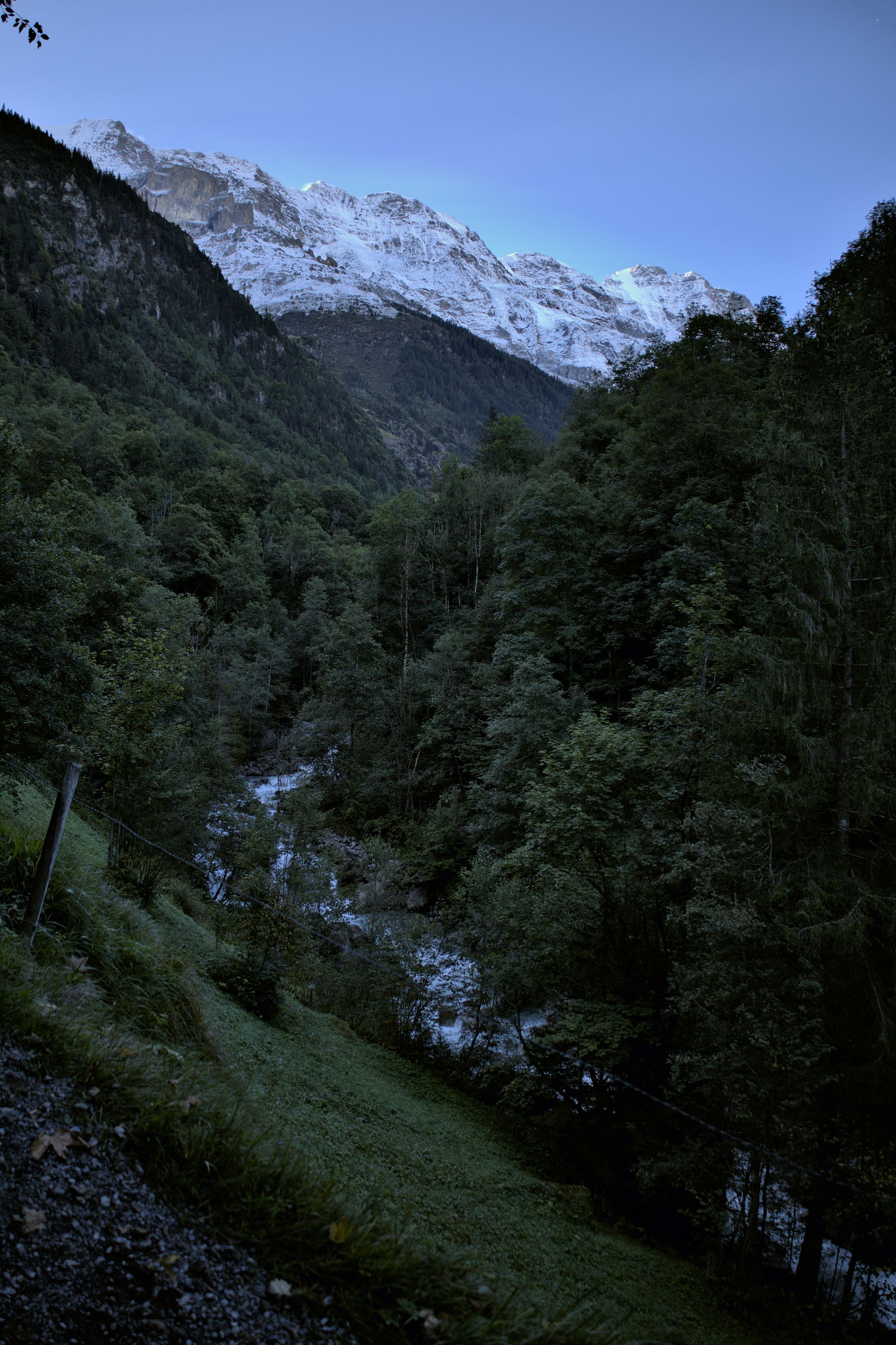 The tour starts at the Stechelberg bus stop. The hike starts by following the Weisse Lütschine river up to the Traueschaulen hamlet. The first mountain cliffs are visible early in the hike, as well as several waterfalls.