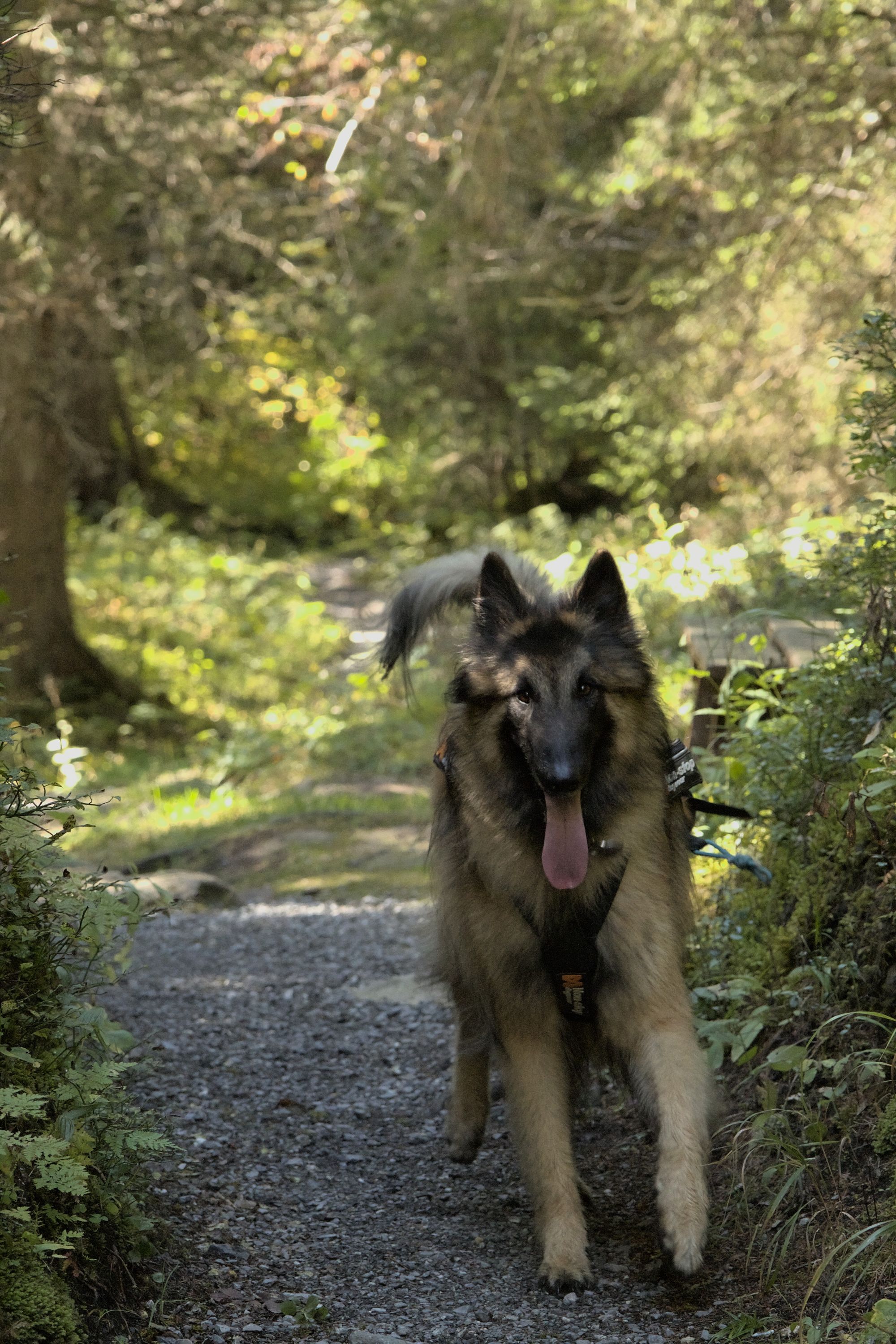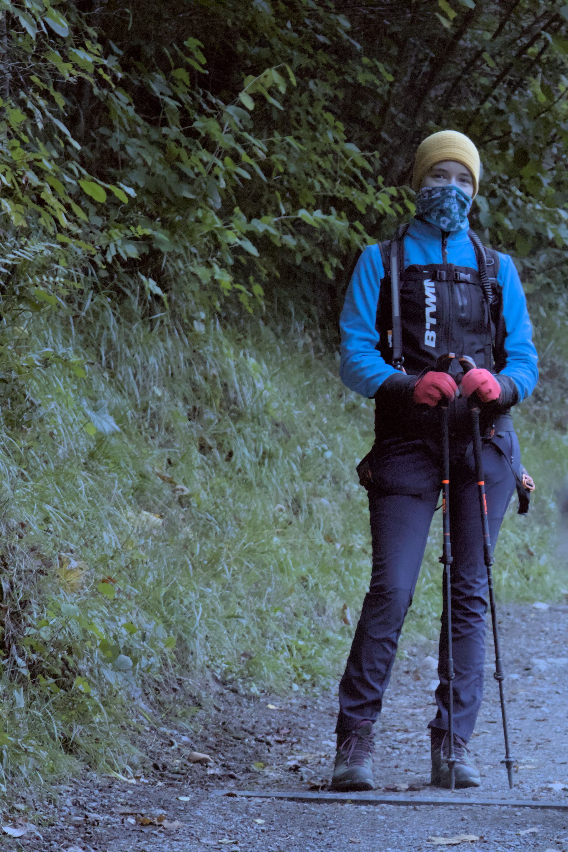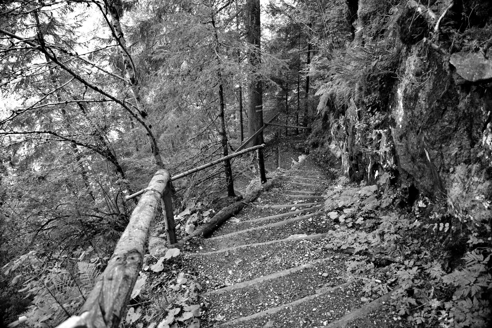 Le chemin fait ensuite une boucle et retourne sur ses pas. Une petite partie du chemin est dans une foret qui vient cacher le paysage et renferme une petite cascade. Ce versant de la vallée est ensoleillé l'après midi. Il s'agit d'un très bon endroit pour déjeuner. Des bancs sont là pour accueillir les randonneurs.