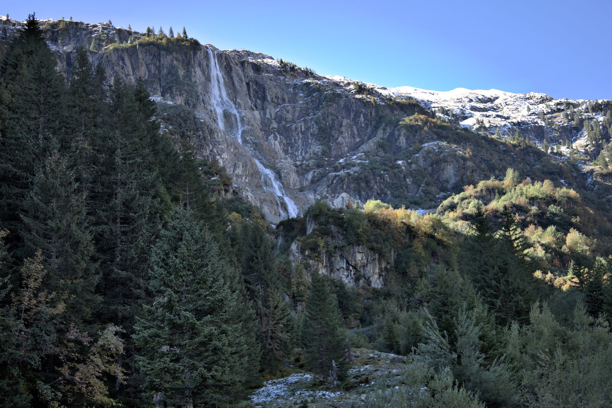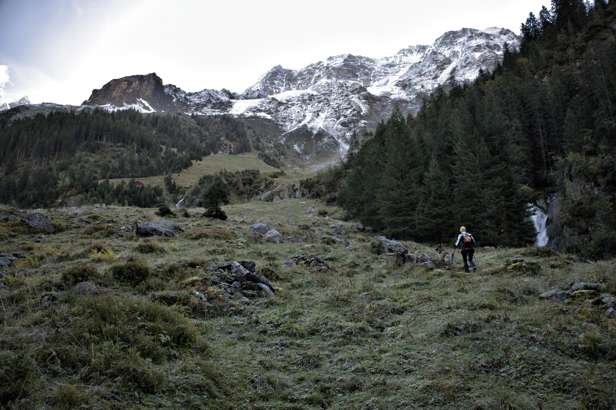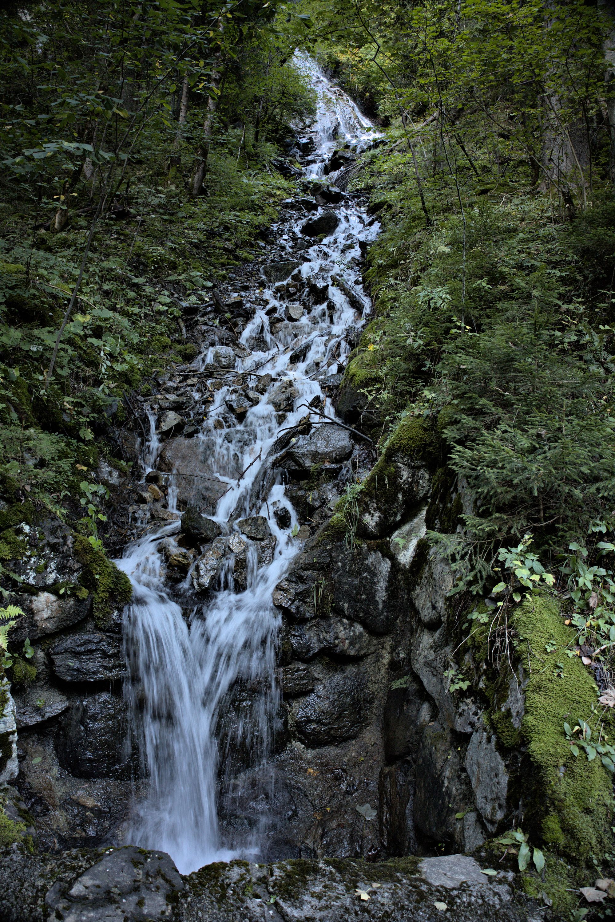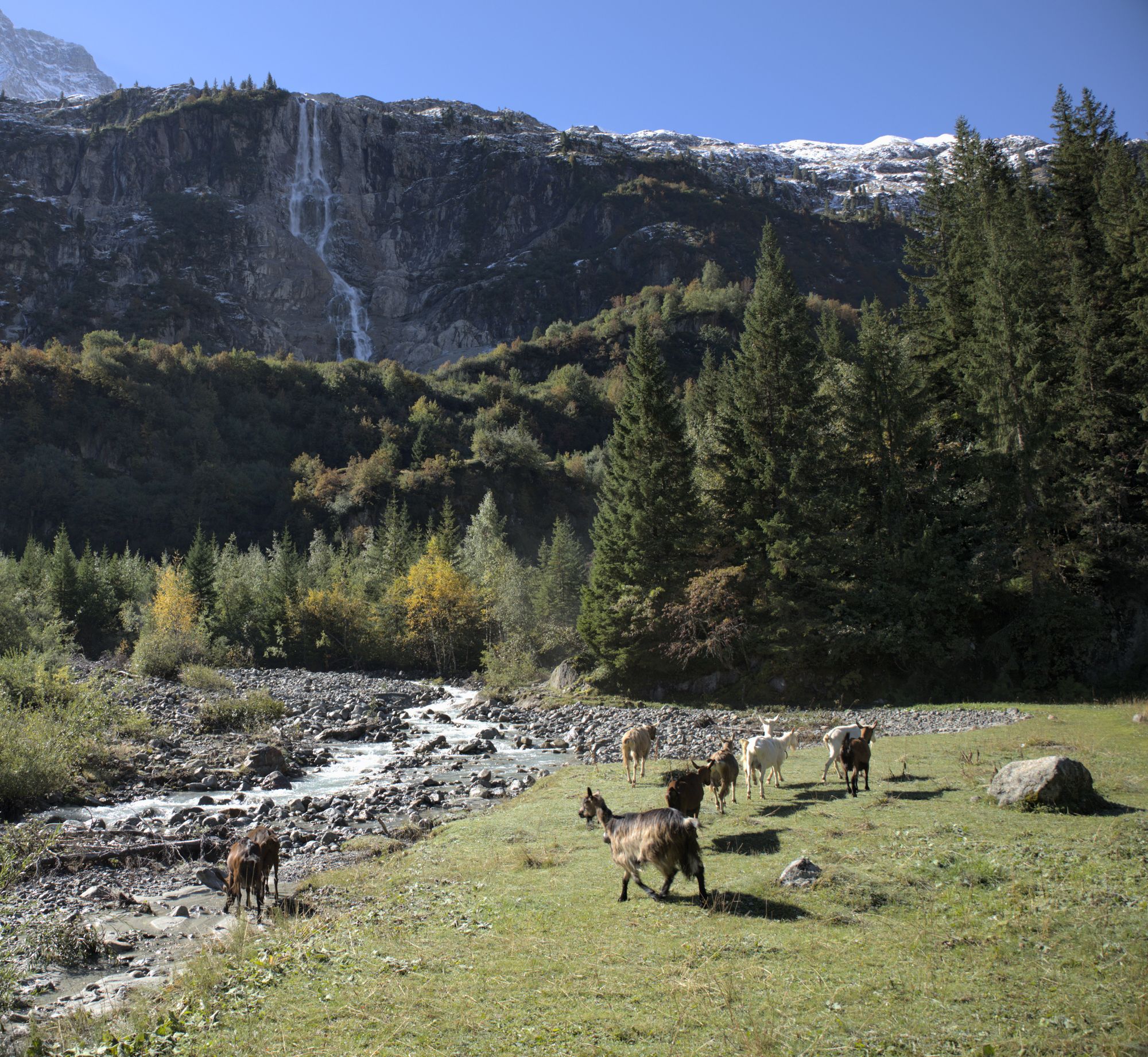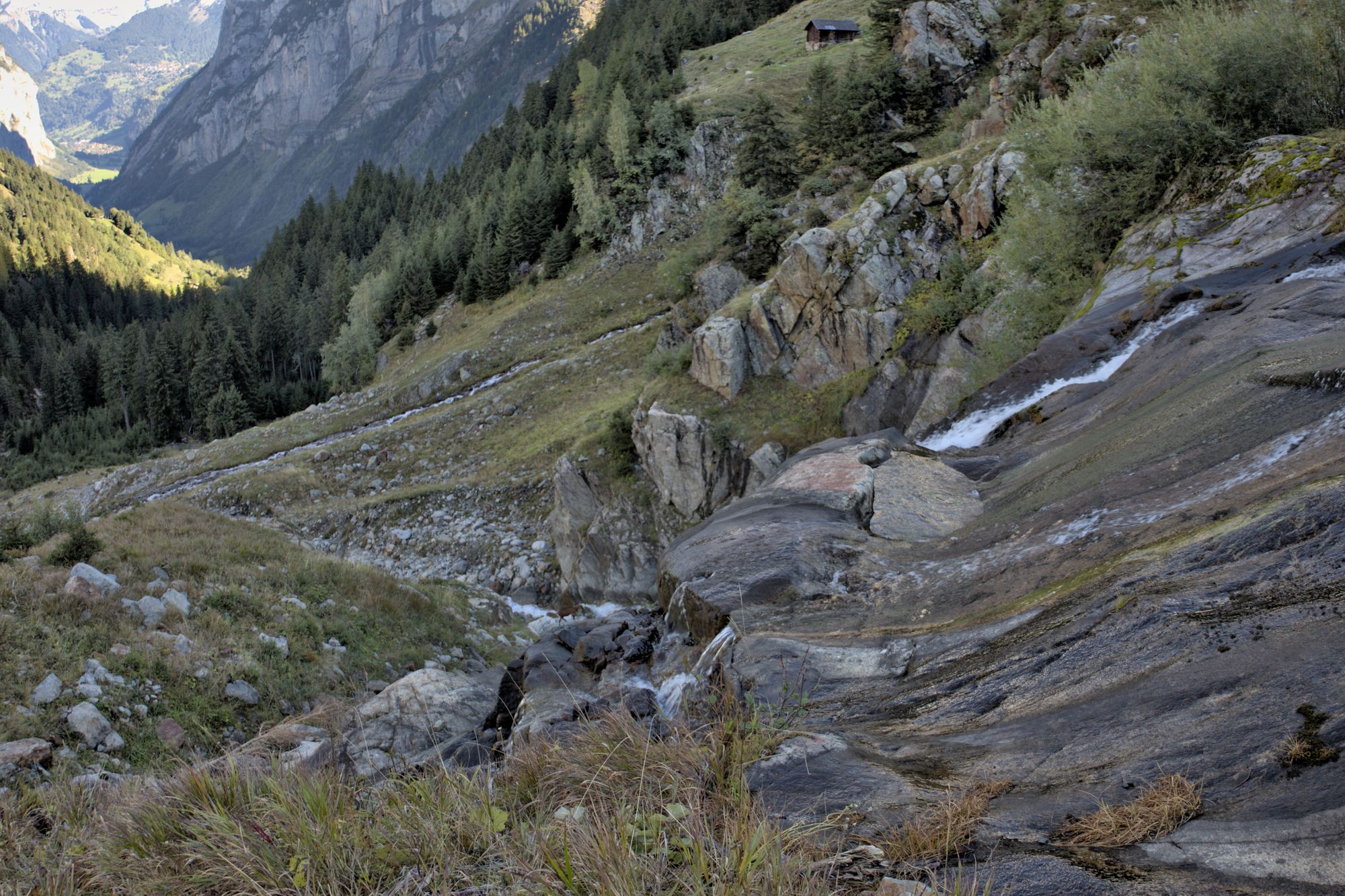 After crossing the river, the path rises and you will have access to views of the entire valley. Goats can be encountered and are rather unfriendly to dogs, as they will follow them. The path leads to the bottom of the Schmadribachfälle which is the biggest and most impressive waterfall of the valley. Depending on the time of the day, the area can be very shaded.