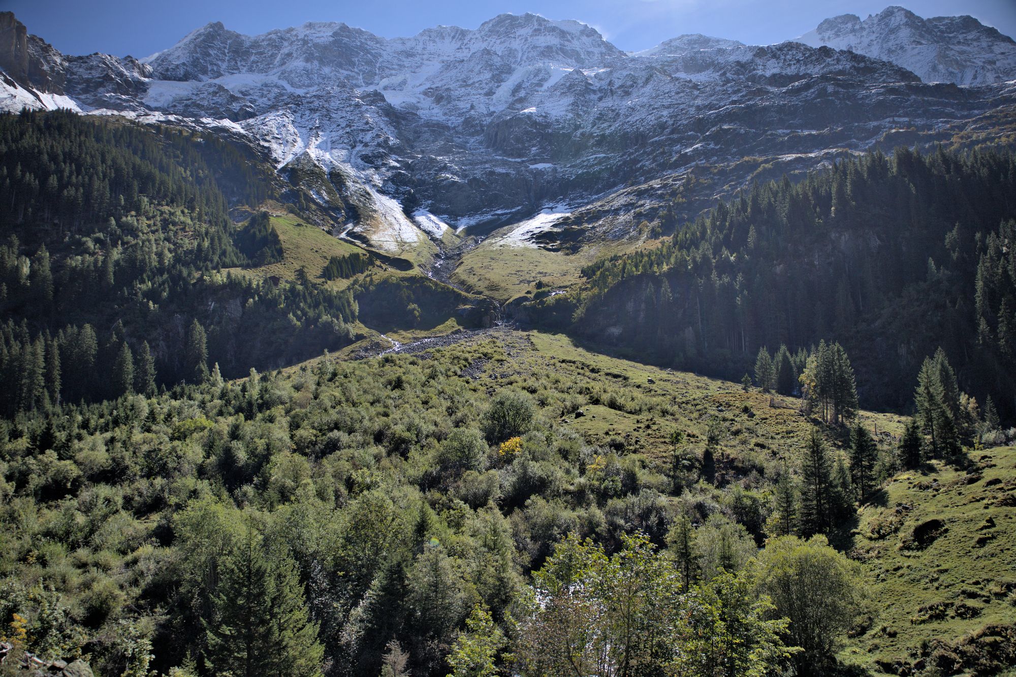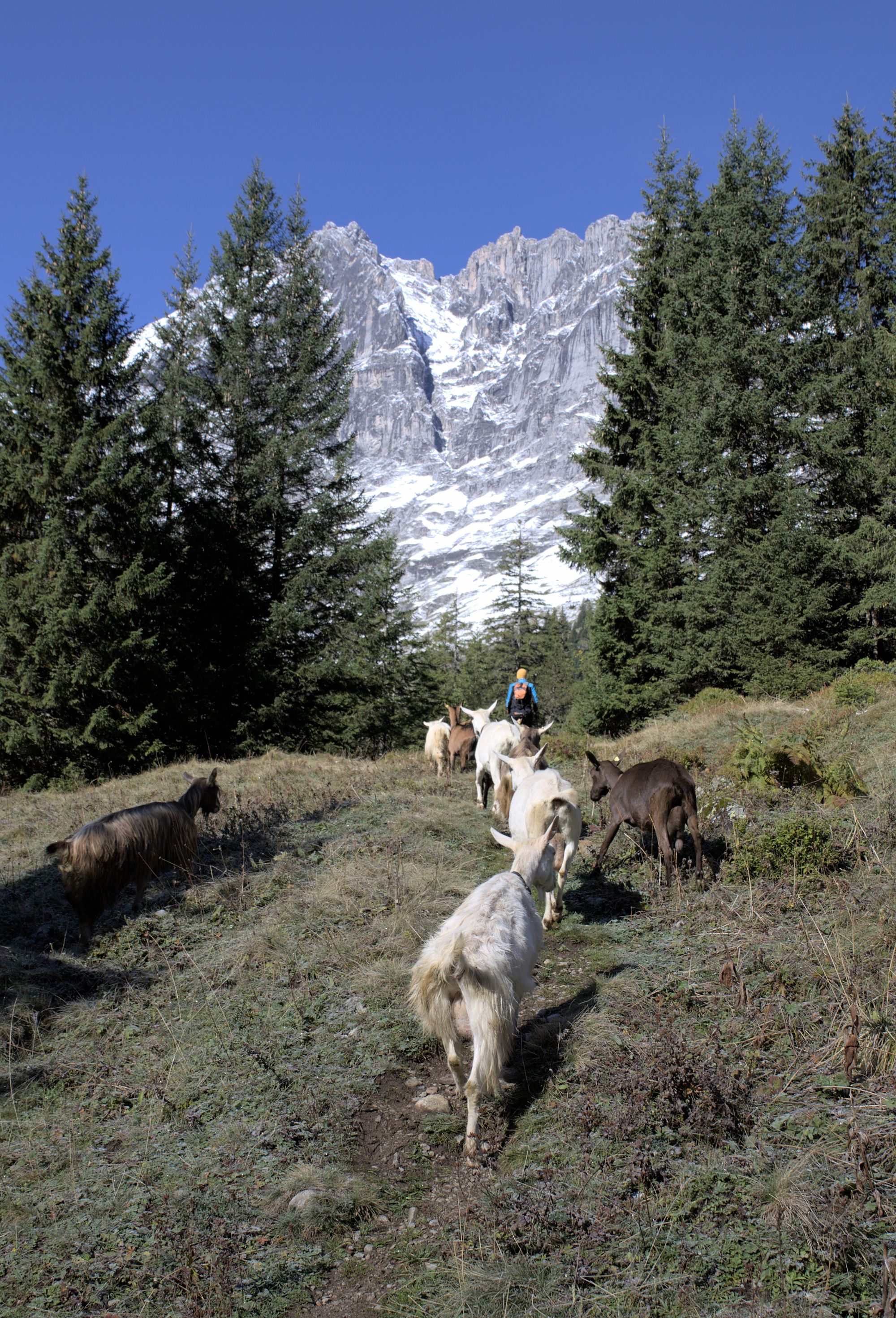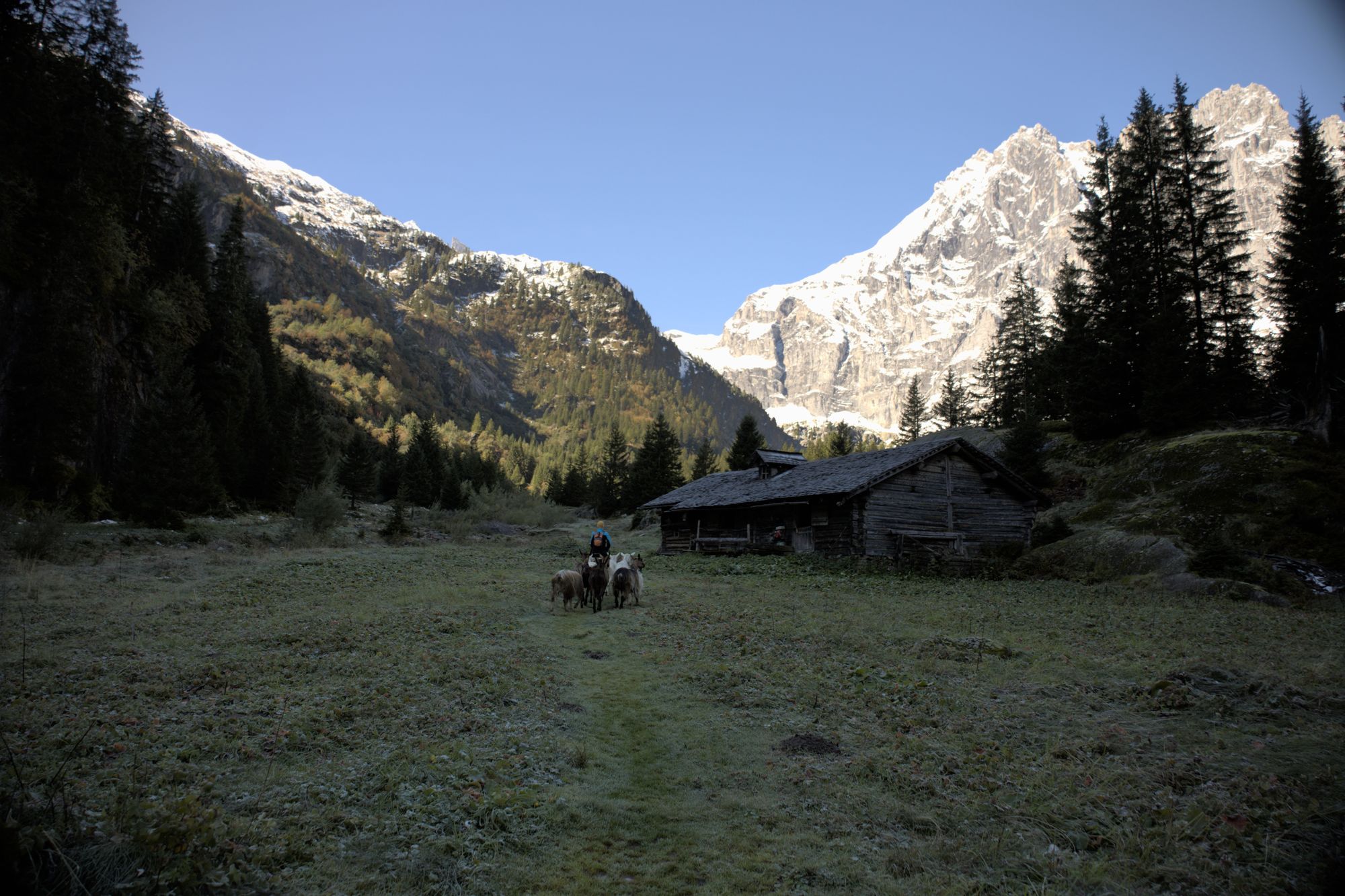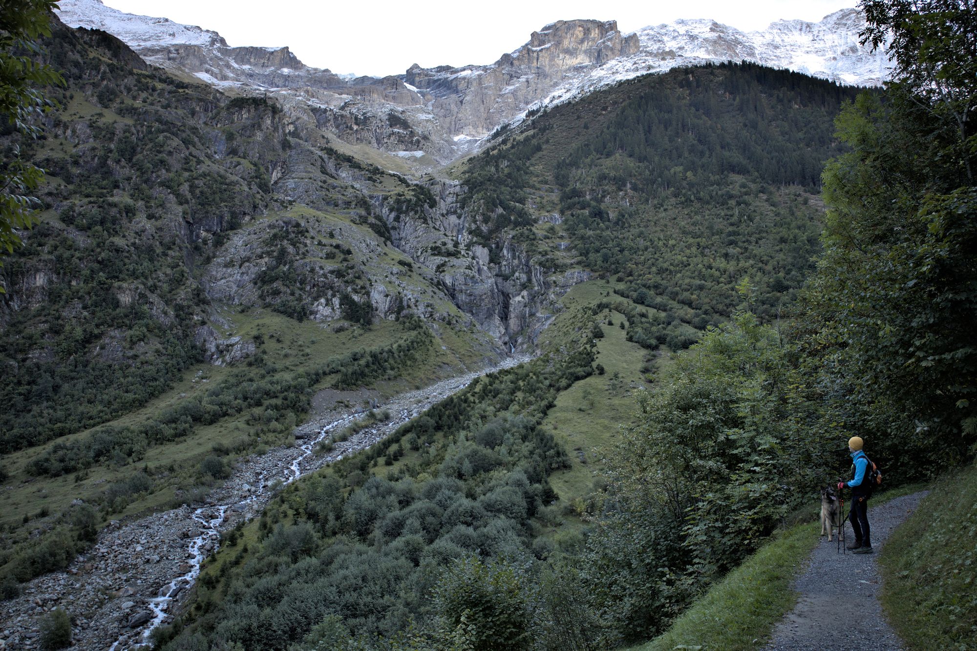 After crossing the river, the path rises and you will have access to views of the entire valley. Goats can be encountered and are rather unfriendly to dogs, as they will follow them. The path leads to the bottom of the Schmadribachfälle which is the biggest and most impressive waterfall of the valley. Depending on the time of the day, the area can be very shaded.
